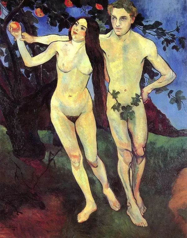 從她1909年創(chuàng)作的《亞當與夏娃》一畫中可見明亮而富有動感的男女人體,在環(huán)境配置表現手法上隱約可見高更的裝飾風格。